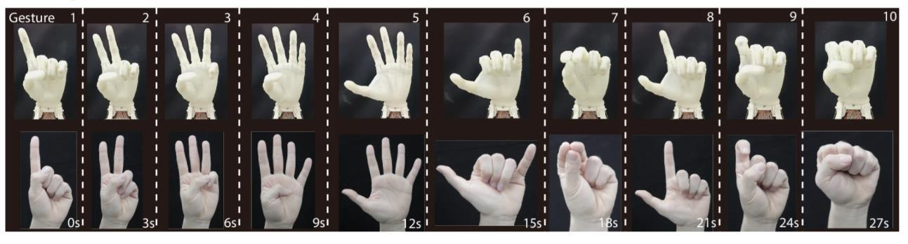 Figure 2. Gestures produced by the prosthetic compared to a human hand, both showing numbers 1-10 in Chinese sign language.
