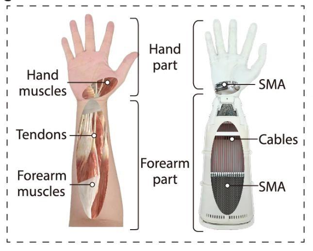 Figure 1. A diagram comparing the prosthetic produced at the University of Science andTechnology in Chinato the human hand. It shows the location of the actuators in the wrist and forearm.