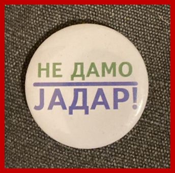 Figure 3: Original photo of a Serbian protest badge. It reads ‘We will not give away the Jadar!’, referring to the region after which the lithium-containing mineral, jadarite, gets its name (Whitfield et al., 2007)