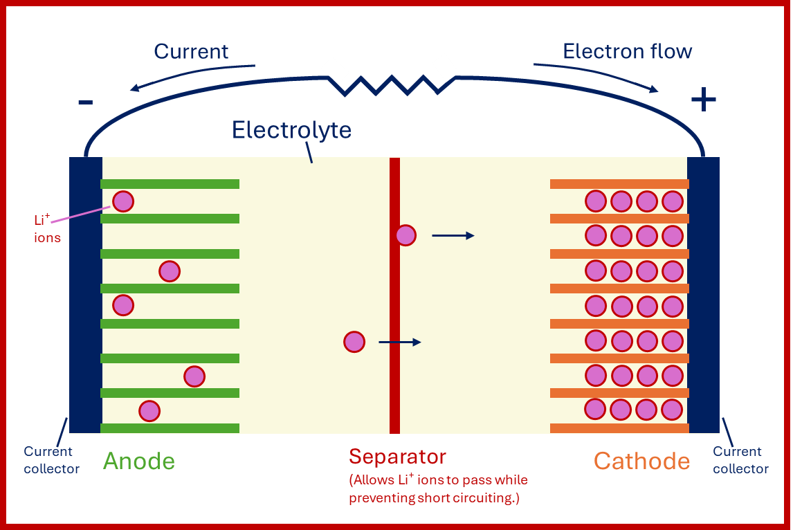 In electrochemical cells (individual units inside batteries), chemical reactions occur at two electrodes: at the anode, electrons (and positive ions, here Li⁺) are released, and at the cathode, accepted. While positive ions move through a liquid electrolyte and separator, the electrons flow through an external circuit; electrical current has been generated!